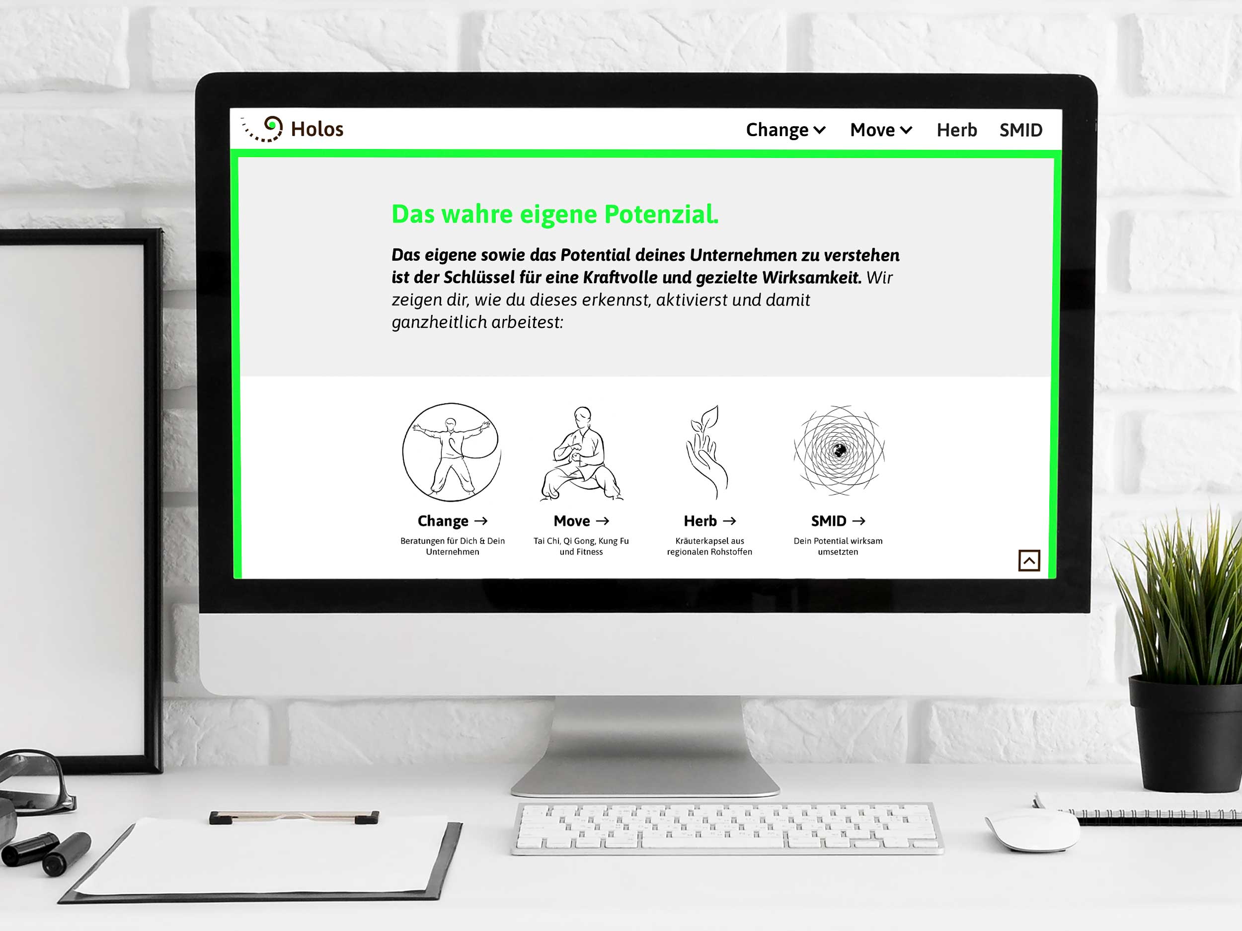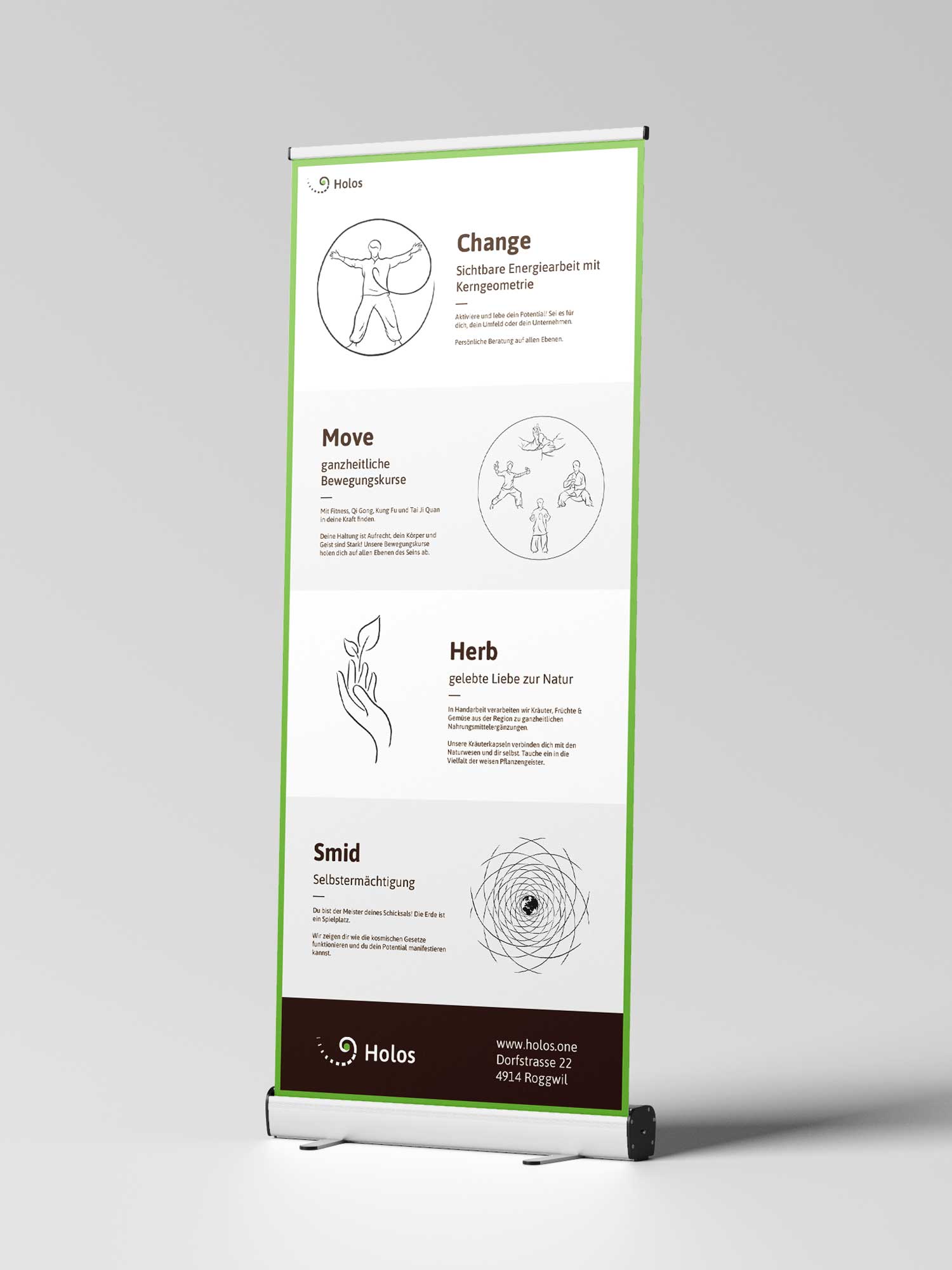 Holos steht für Life Coaching mit Fokus auf Kerngeometrie und Bewegungskurse. Meine Aufgabe lag in der Entwicklung von Logo und Webseite. Im Logo schließen sich Zentrierung, Vertiefung, Fokus und die goldene Spirale zusammen und stehen somit für die Kernelemente der Holos Leistungen. Das neue Design der Webseite bietet Raum für eine verständliche und klare Präsentation aller Angebote. Zudem unterstütze ich Holos bei der Erstellung diverser Marketingmaterialien.