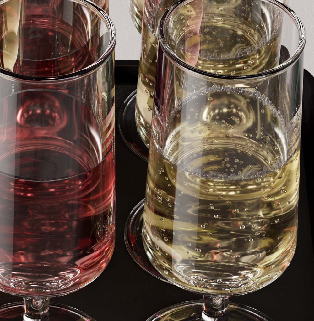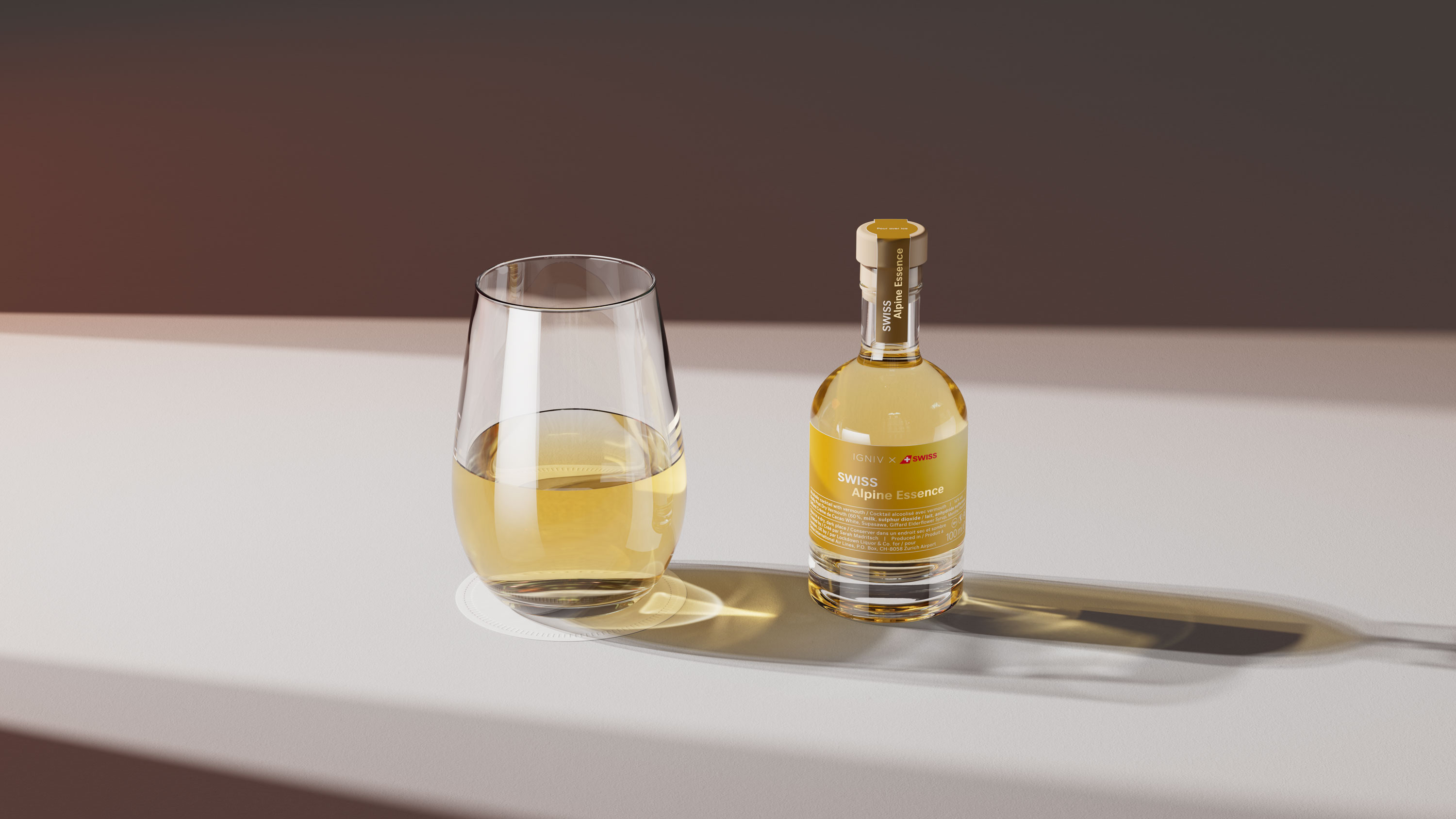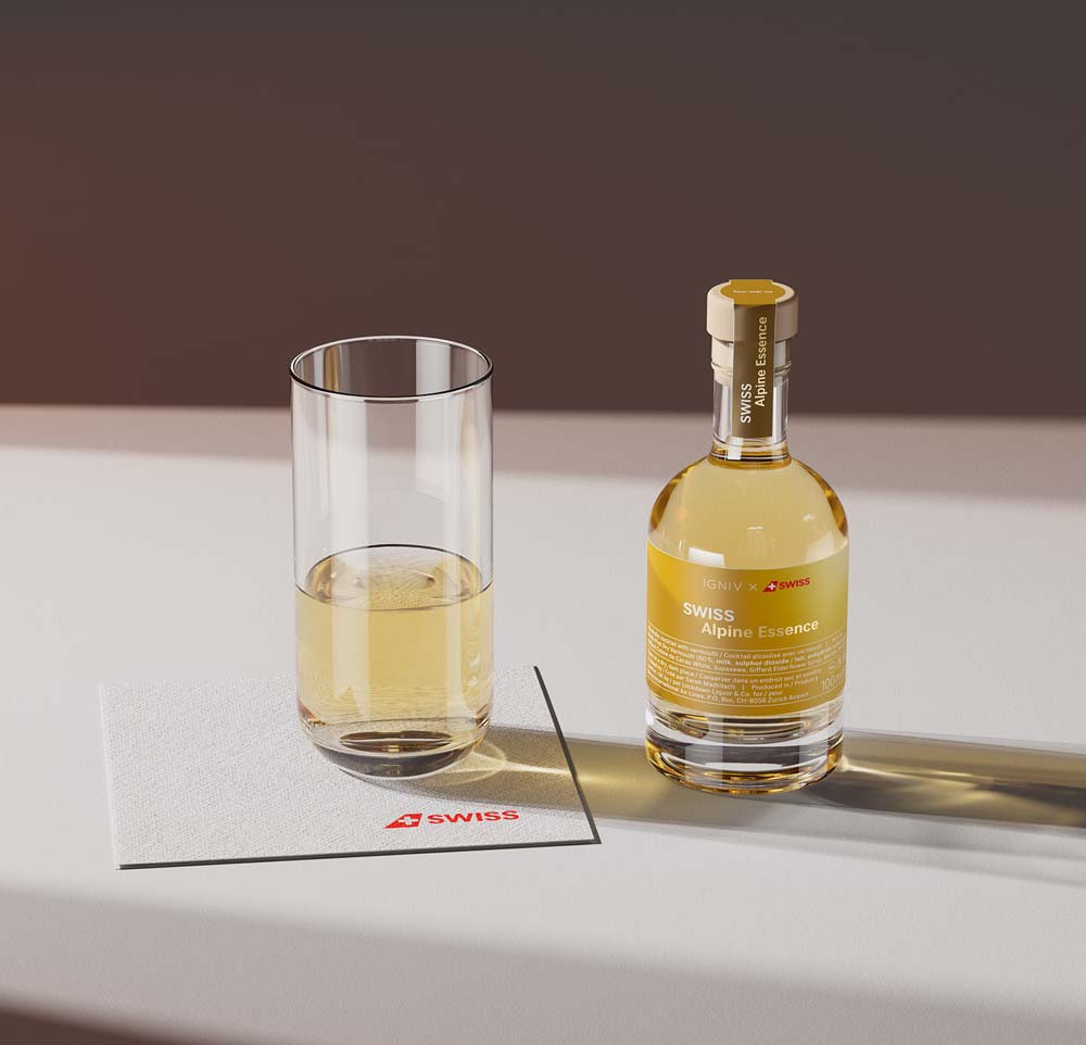 Futureworks gestaltete für SWISS die neuen Etiketten der Signature Cocktails und beauftragte deren realistische Visualisierung im authentischen Produktkontext. Die Beleuchtung orientiert sich konsequent am etablierten Branding von SWISS und verstärkt so die visuelle Markenkonsistenz. Bei den Signature Cocktails handelt es sich um exklusiv für SWISS entwickelte Kreationen, die erstmals unter dieser Marke lanciert werden. Die fotorealistischen Visualisierungen schufen die Grundlage für einen direkten Variantenvergleich und ermöglichten eine fundierte Entscheidung zugunsten des finalen Favoriten. Für eine präzise Modellierung der Gläser und Flaschen wurden physische Samples bereitgestellt, sodass exakte Masse und Proportionen direkt abgelesen und die Objekte realitätsgetreu nachgebildet werden konnten.